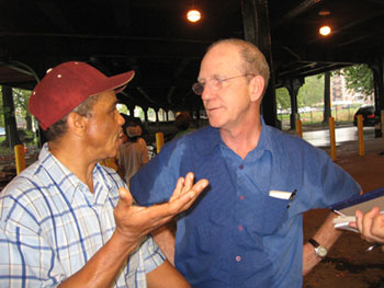 Chris Hoeppner, right, Socialist Workers Party candidate for U.S. Congress in New York's 9th District, talks with factory worker Lloyd Wright while campaigning in Sheepshead Bay, Brooklyn, August 9.